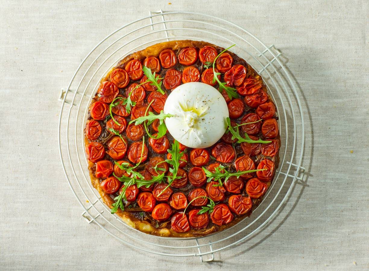 Laat 5 min. afkoelen in de vorm en keer om op een bord. Verdeel de burrata over het midden van de taart en serveer met de rucola.