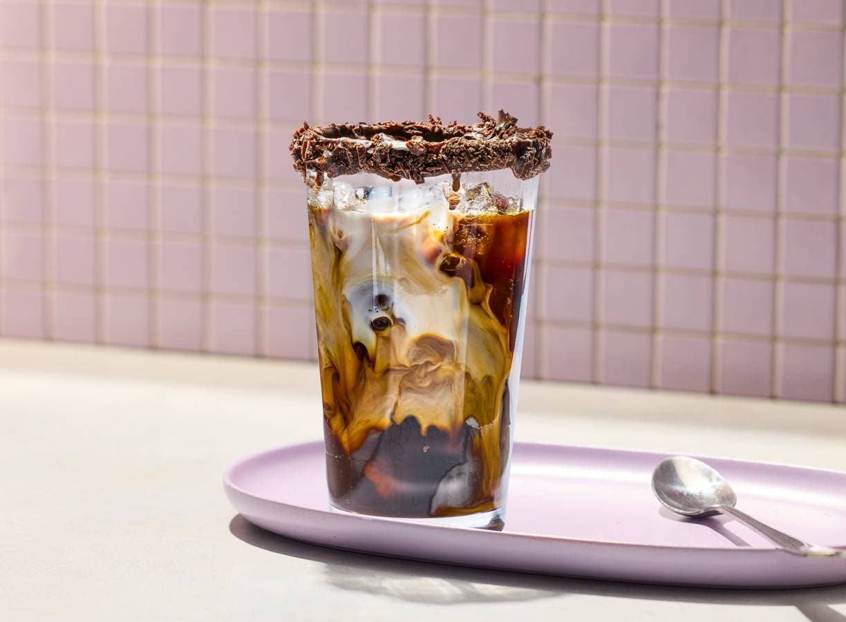 Verfrissende ijskoffie met een feestelijke twist dankzij het mooie chocolade-randje aan het glas.