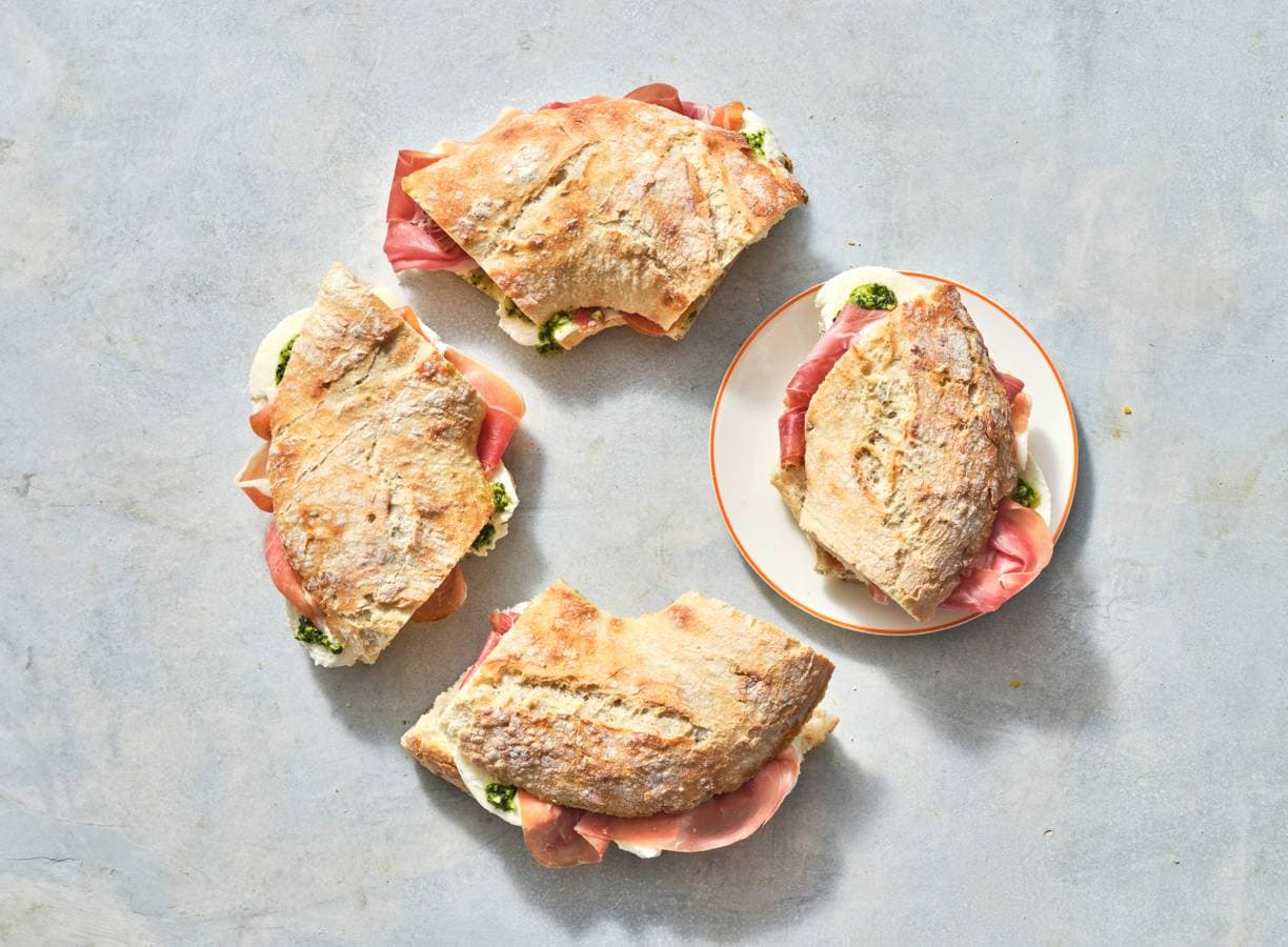 Besmeer de onderste helft van het brood met de pesto en beleg met de mozzarella en prosciutto di parma. Breng op smaak met peper en eventueel zout. Dek af met de bovenste helft van het brood en druk licht aan.