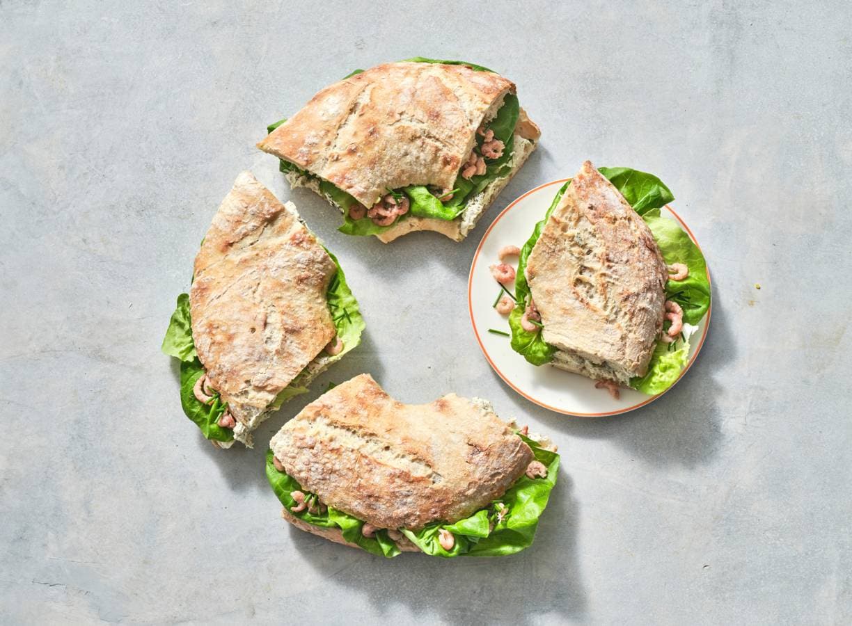 Leg de blaadjes sla en Hollandse garnalen erop. Breng op smaak met peper en eventueel zout. Dek af met de bovenste helft van het brood en druk licht aan.