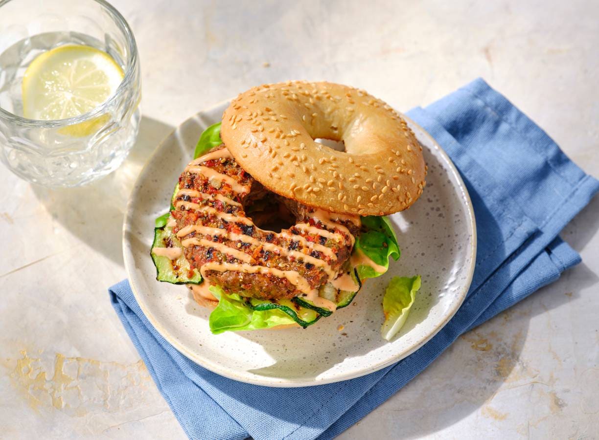 Burgertrend-alert! Deze burger met een gat in het midden, geserveerd op een bagel, is onze nieuwe favoriet. Heerlijk met courgette en srirachamayo.
