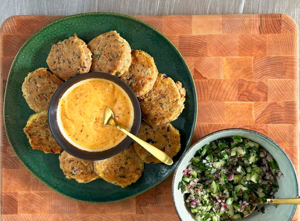 Viskoekjes à la London Loy! London geeft deze viskoekjes wat extra proteïne door er tonijn aan toe te voegen. Serveer ze met een pittige sambalmayo en een frisse komkommersalade om het helemaal af te maken.