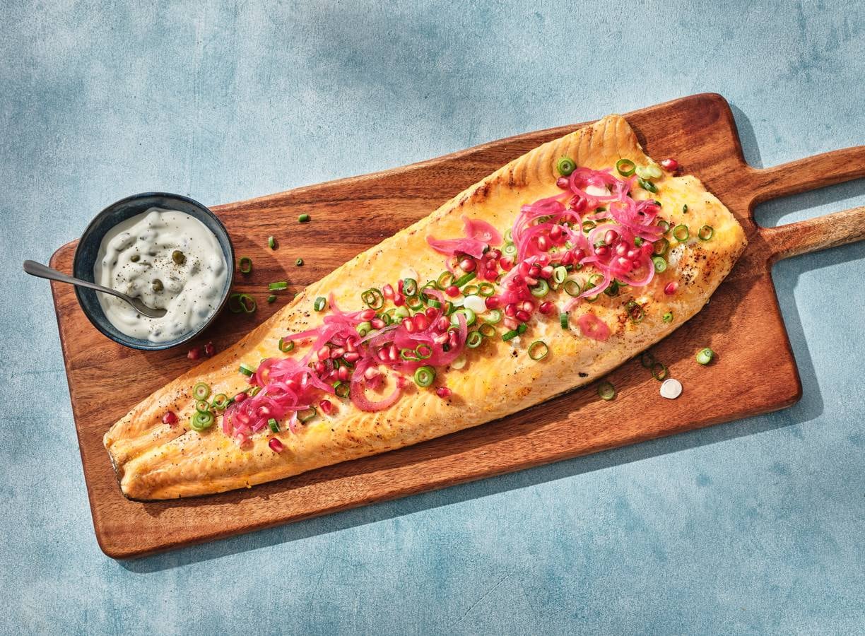 Snijd de bosuitjes in ringetjes. Verdeel de granaatappelpitjes, rode uienringen en bosui over de zalmzijde en serveer met de kappertjesmayonaise.