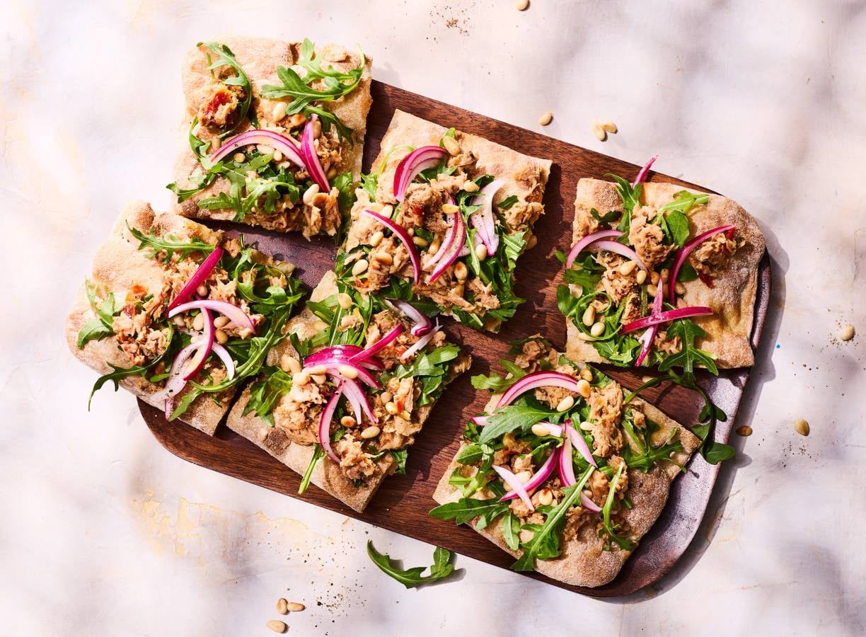 Gebruik pinsa als bodem en beleg met op smaak gebrachte tonijn, pijnboompitjes en een knapperig rood uitje. Voilá, je hebt easy hapje om te delen op de borrel!