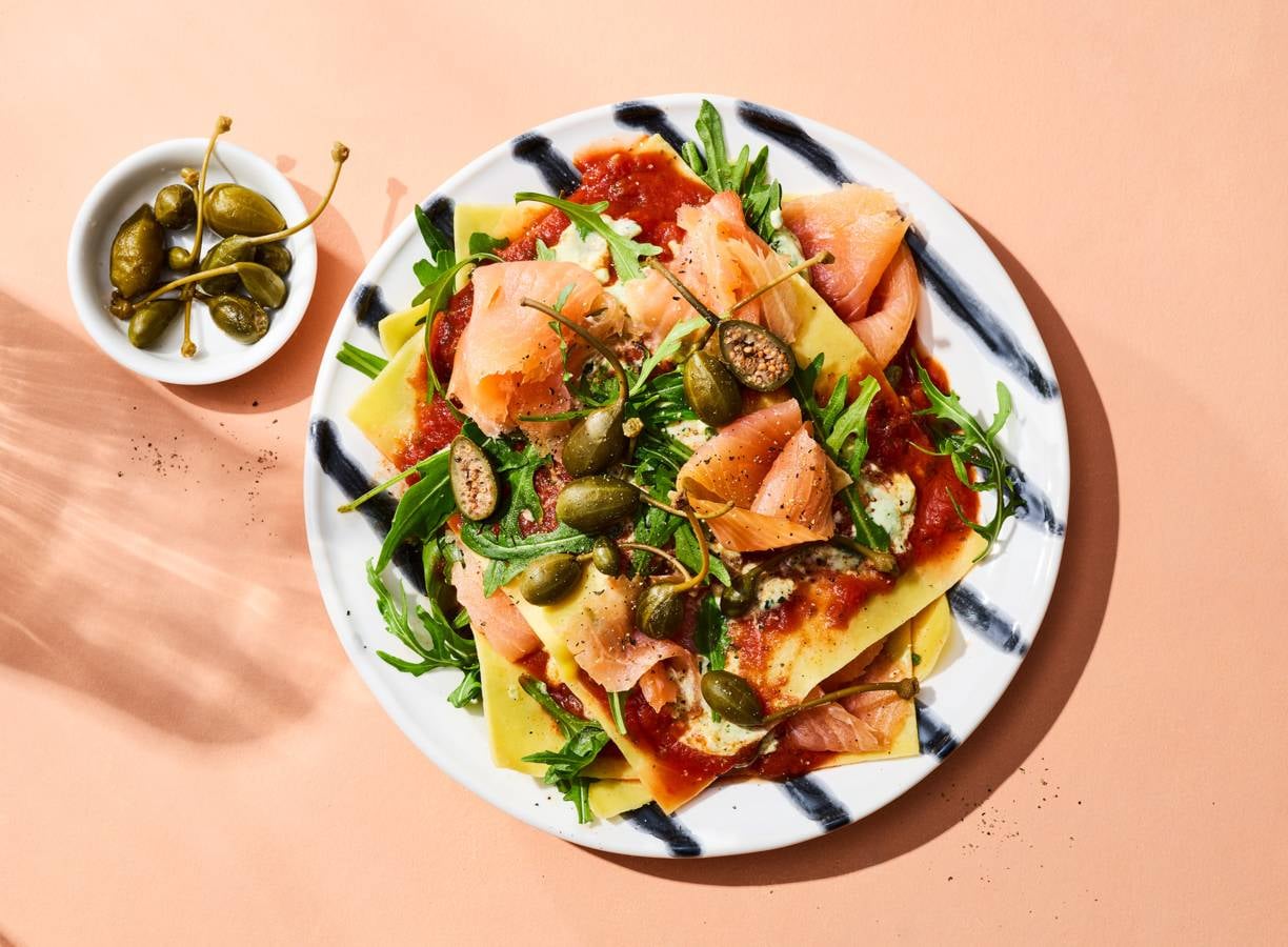 Leg op elk bord een lasagnevel en verdeel ⅓ van de tomatensaus, ⅓ van de pestosaus, ⅓ van de rucola en ⅓ van de zalm erover. Maak zo nog 2 lagen. Verdeel de kapperappeltjes erover en serveer.