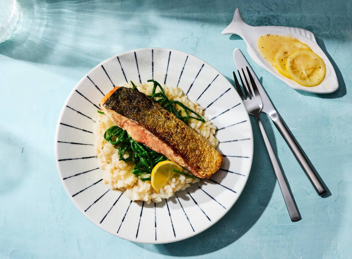 Gegrilde zalm met citroen-botersaus, zeekraal en risotto