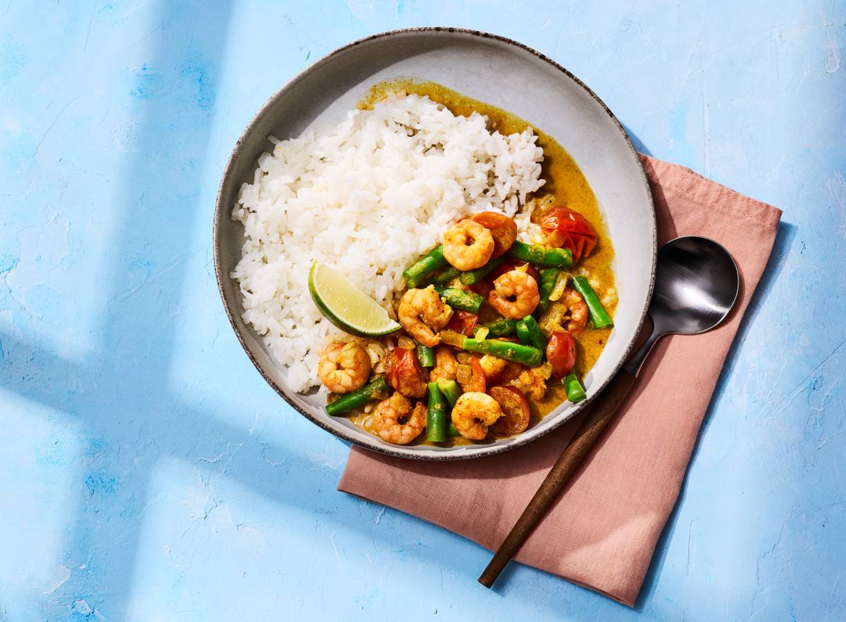 Gele curry met garnalen en rijst