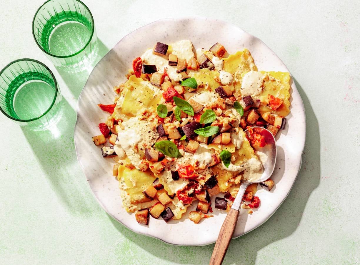 Hak de rest van de walnoten grof. Scheur de rest van de basilicumblaadjes in stukken en meng door de aubergine. Verdeel de ravioli over 4 diepe borden en verdeel de aubergine erover. Bestrooi met de rest van de walnoten.