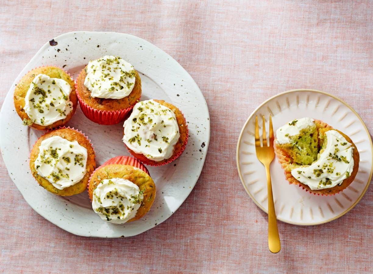 Verdeel de roomkaas over de afgekoelde muffins en bestrooi met de citroenmuntsuiker.
