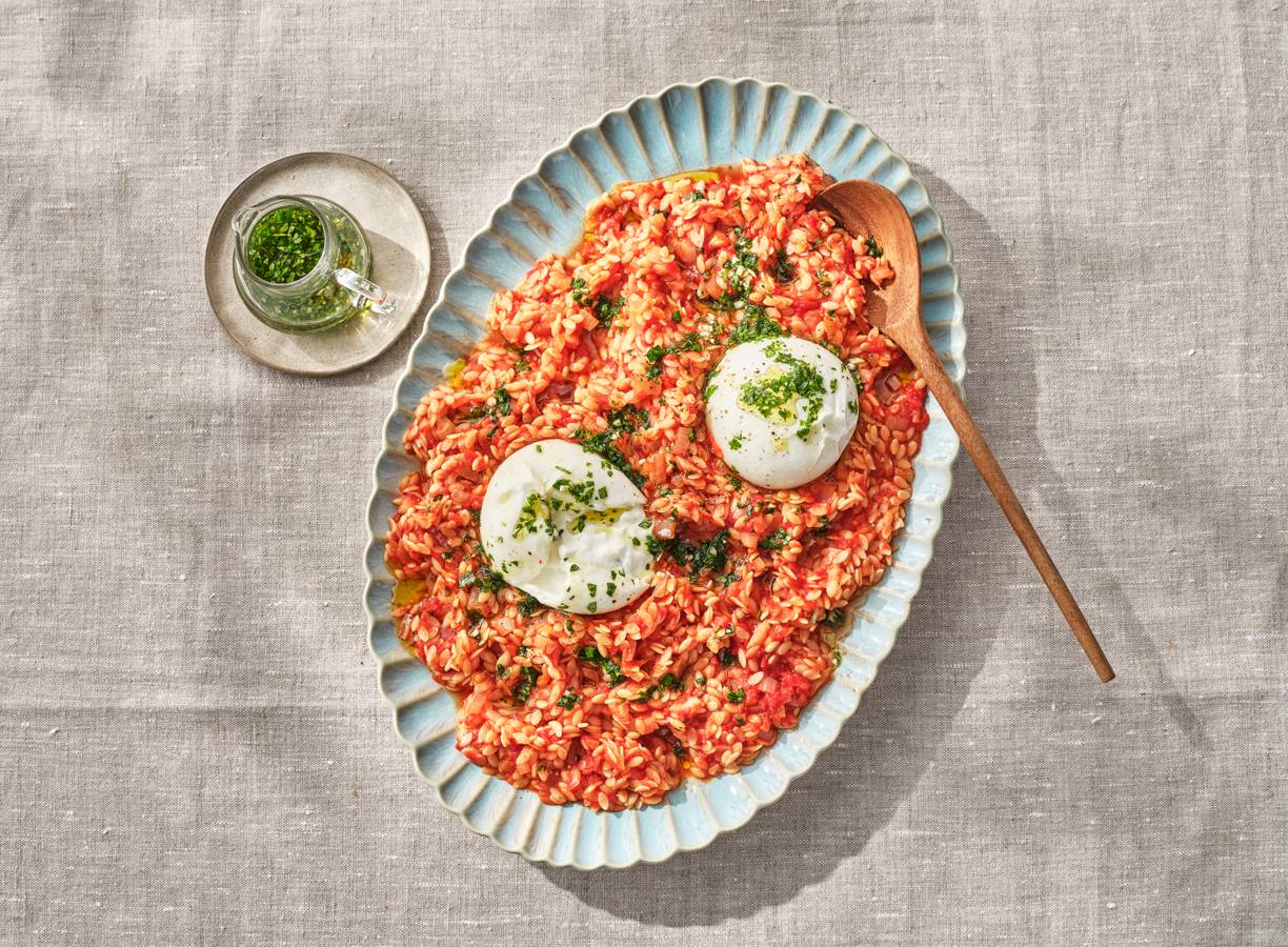 Twee favorieten op één bord: orzo en romige burrata. Deze vegetarische variant staat binnen 20 minuten op tafel. Maak ‘m af met chilivlokken, cremaceto en verse basilicum.