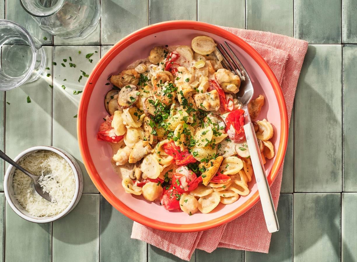 Pollo alla Romana is een traditioneel Italiaans gerecht waarbij kip langzaam wordt gegaard met tomaat en ui. In deze variant serveren we het met orecchiette, kastanjechampignons en romige Pecorino. Waan je aan de Italiaanse keukentafel.