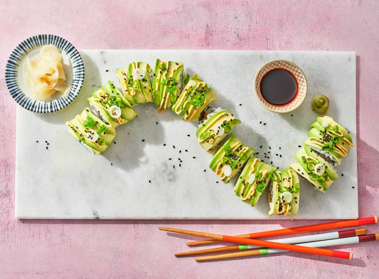 Indruk maken tijdens je sushi-avond? Maak een dragon roll! Deze kleurrijke uramaki heeft rijst aan de buitenkant, knapperige tempuragarnaal binnenin en wordt afgemaakt met avocado en spicy mayonaise.