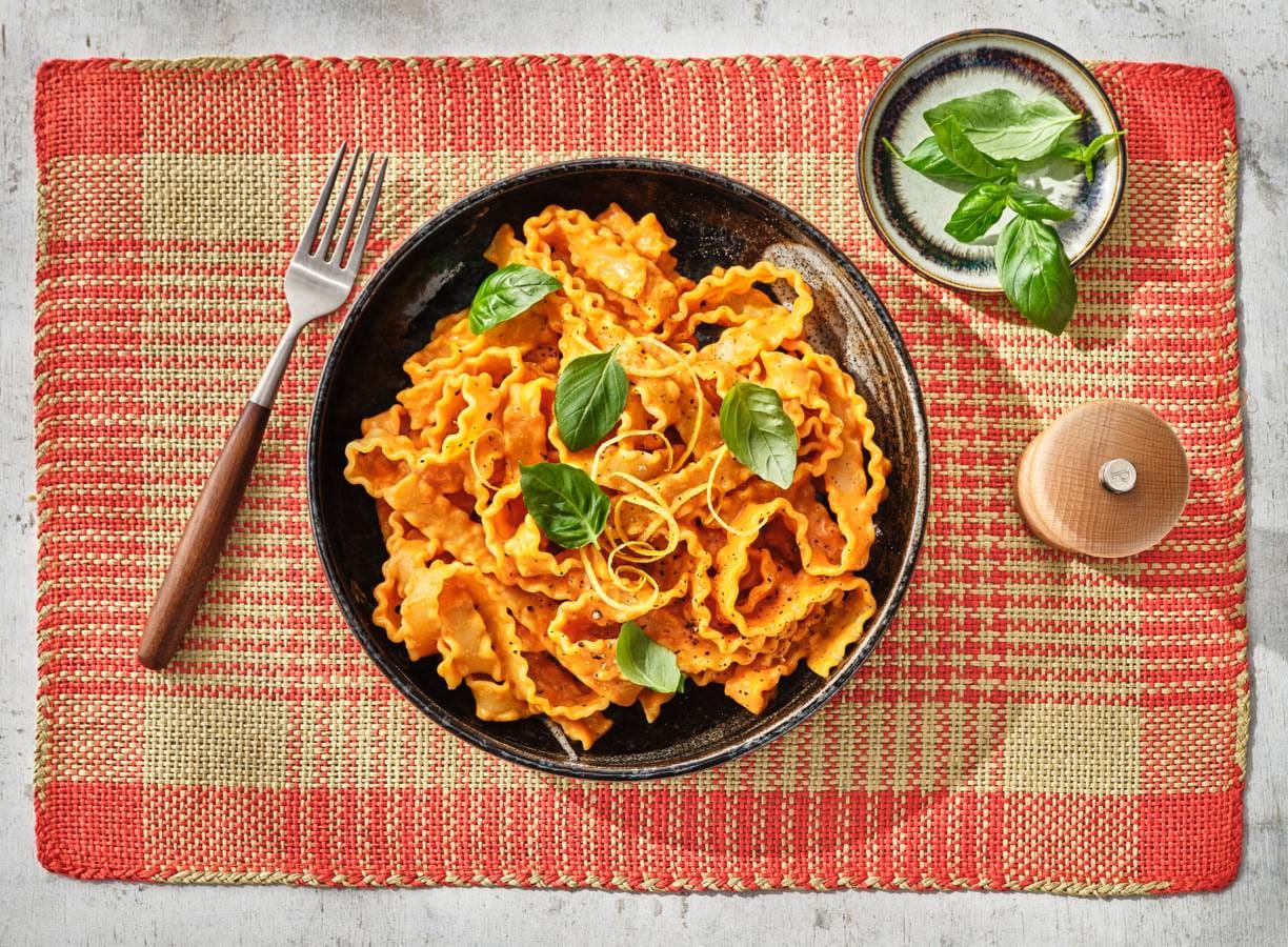 Zin in een pasta met een twist? Mafaldine pasta met geroosterde cherrytomaten, een vleugje knoflook en basilicum is simpel, smaakvol en brengt Italië direct naar je bord!