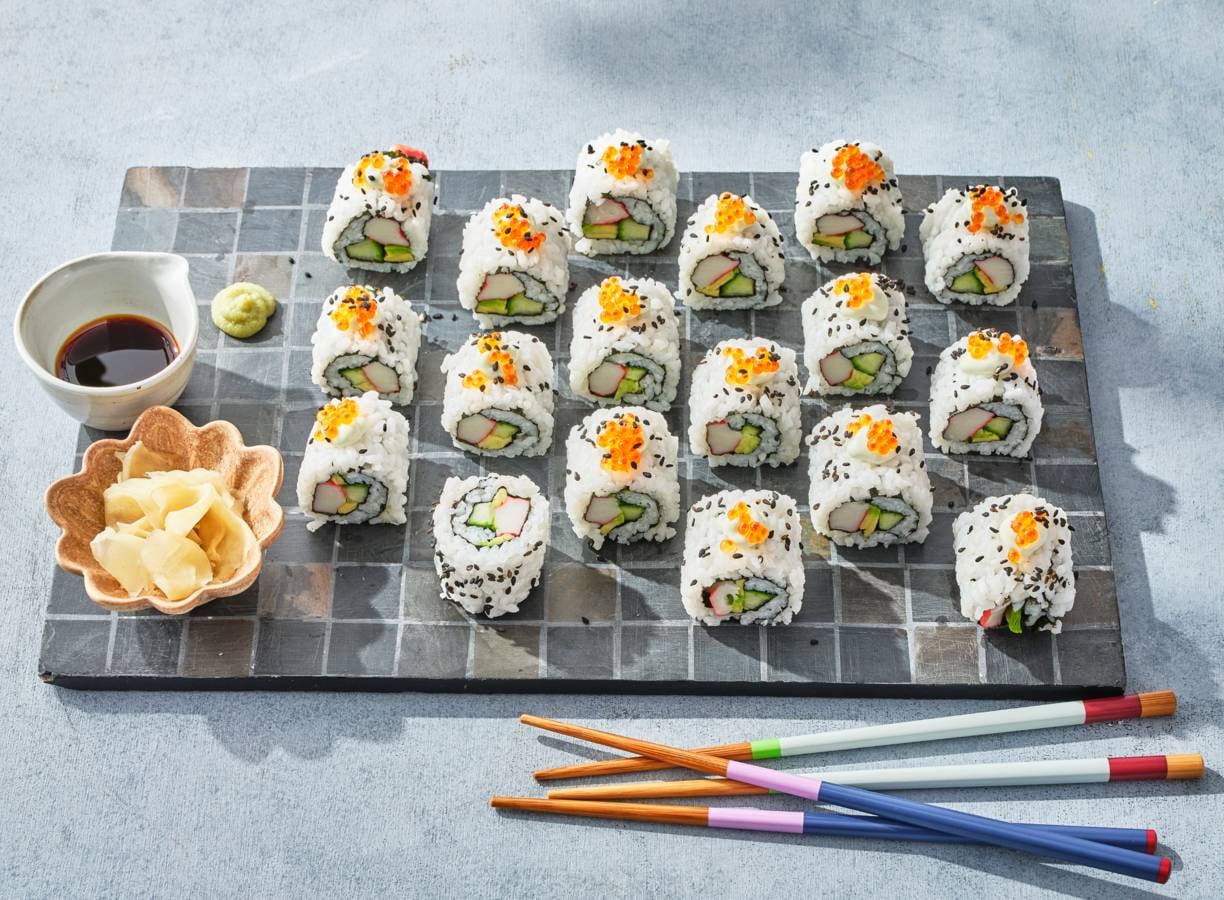 - achtergrondinfoNormaal gesproken wordt de California roll bedekt met tobiko (kleine, oranje vliegvis-eitjes). In dit recept gebruiken we zalmeitjes (ikura).