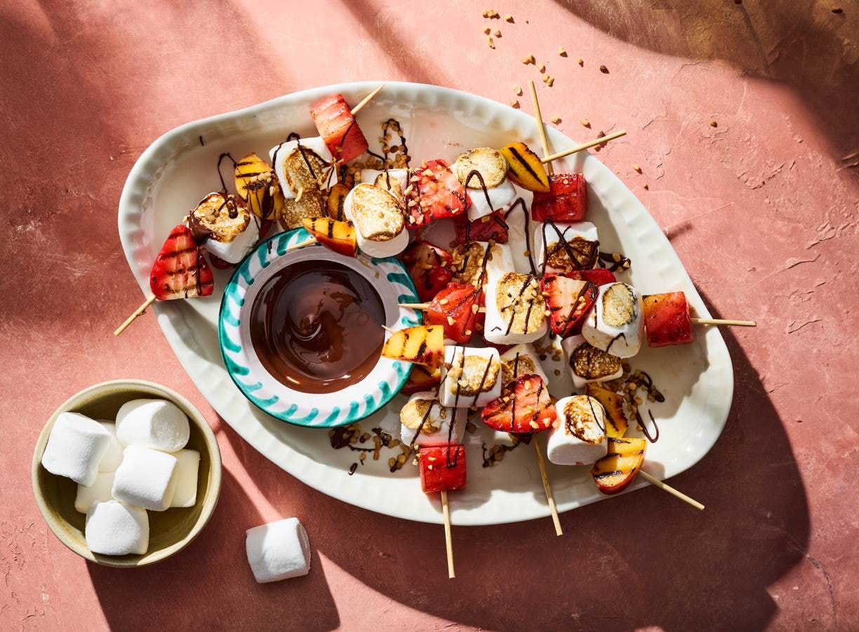 Na de barbecue zin in zoet? Maak je toetje óók op de grill. Deze marshmallow-fruitspiesjes zijn fris, romig en zó fluffy, dat gaat er bij iedereen wel in!