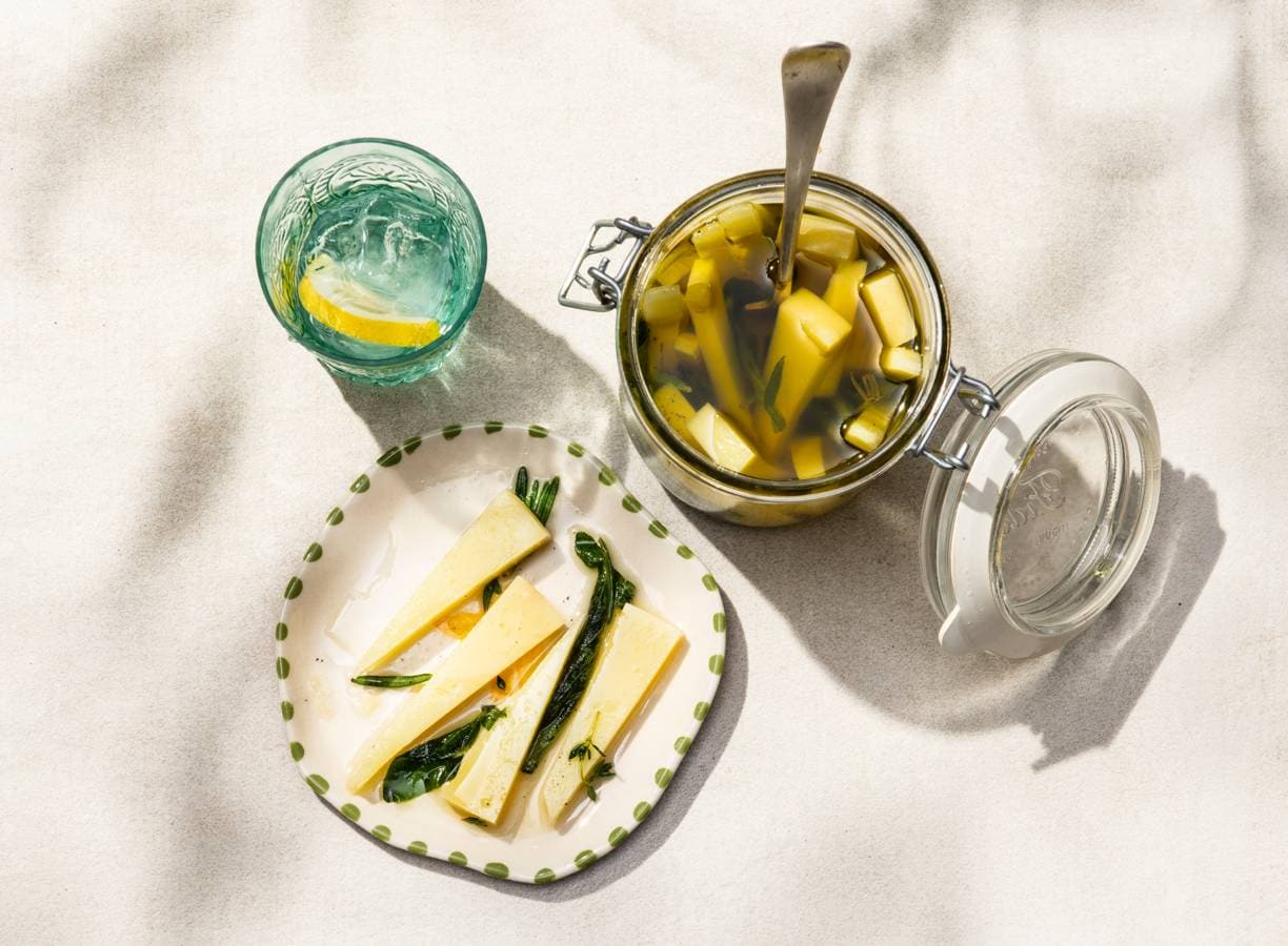 bereidingstip:Je kunt de gemarineerde pecorino 1 week van tevoren maken en goed afgesloten in de koelkast bewaren.