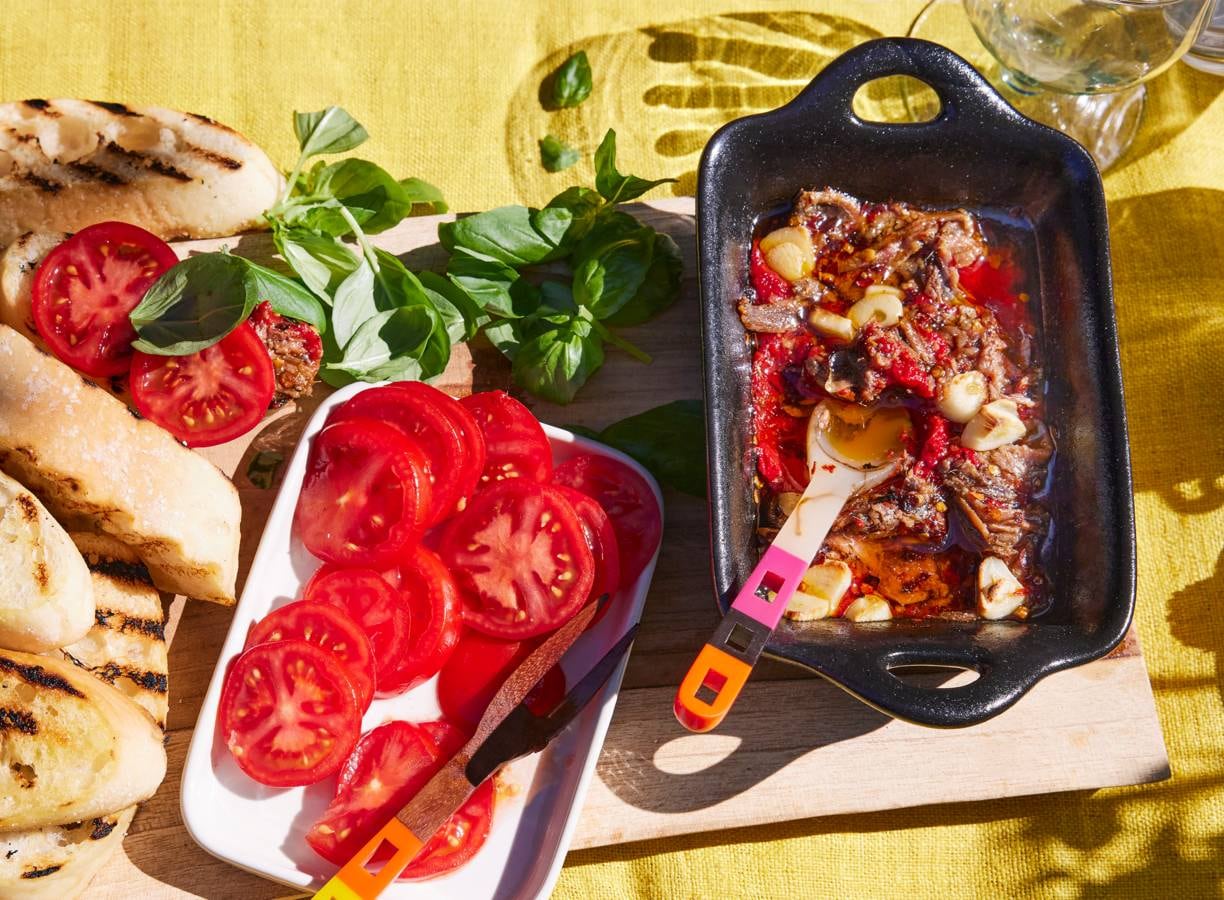 Snijd ondertussen de tomaten in plakjes en scheur het basilicum. Verdeel het brood, ansjovismengsel, de tomaat en het basilicum over een grote schaal.