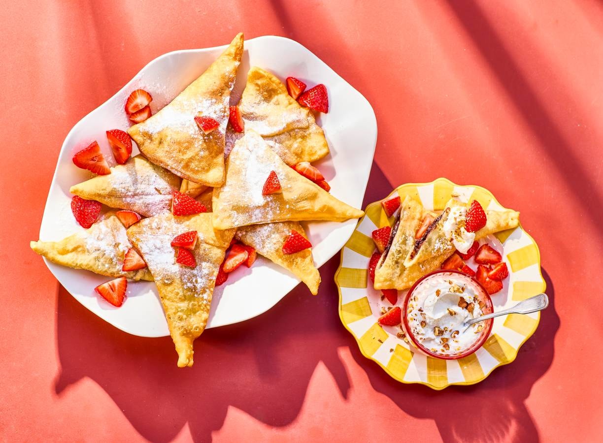 'Panzerotti' zijn gefrituurde, gevulde deeghapjes uit Puglia. London Loy vouwt ze voor het gemak in simpele driehoekjes. Deze variatie met hazelnoot en ricotta is onweerstaanbaar.