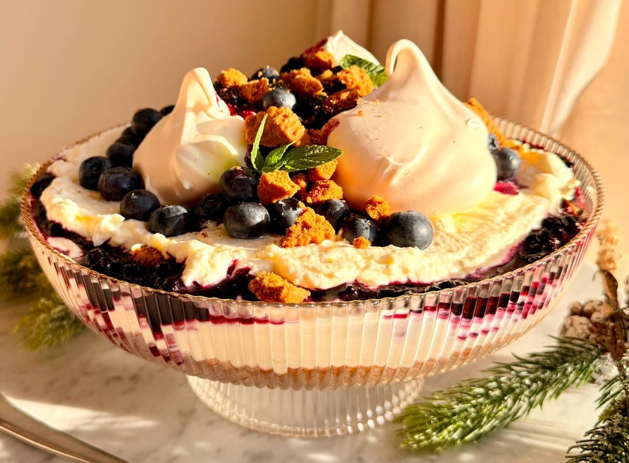 Verkruimel de mini-pavlova erover, verdeel de rest van de blauwe bessenjam en de verse blauwe bessen erover. Verkruimel de rest van de kandijkoek erover en garneer met de muntblaadjes.