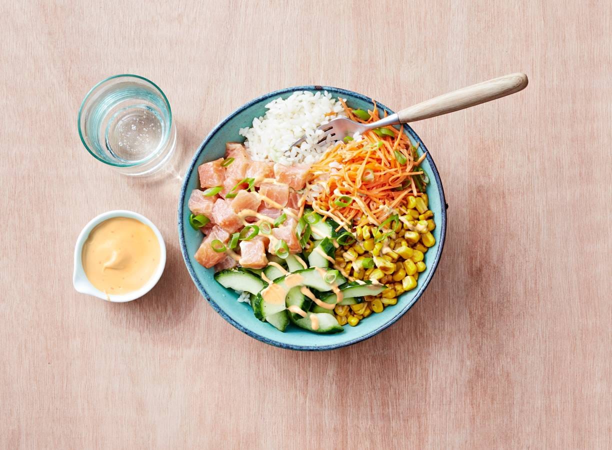 Rijstbowl met gemarineerde sriracha-mayo zalm en gebakken mais (advertorial)