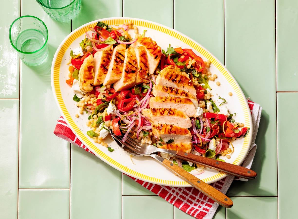 Lekker én snel klaar: dit bordje wint op alle vlakken. Kan ook niet anders met die kruidige parelcouscous, malse vegakip, puntpaprika en feta. It’s a winner!