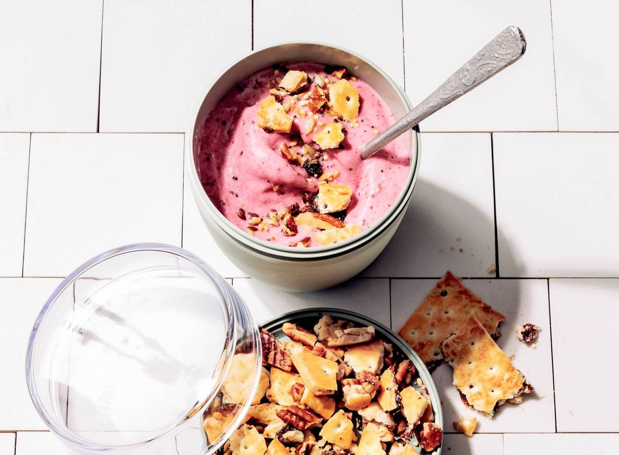 Fris zomerfruit, yoghurt en crunchy crumble on top: met deze snelle ontbijtsmoothie in het vooruitzicht stap je zéker met het goede been uit bed. Ook ideaal voor onderweg.