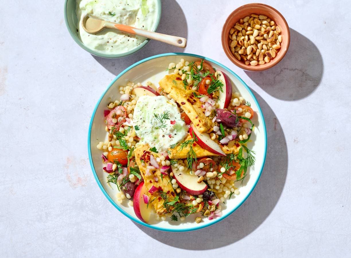 Parelcouscoussalade met hot-honey-grillkaas van Veggilaine