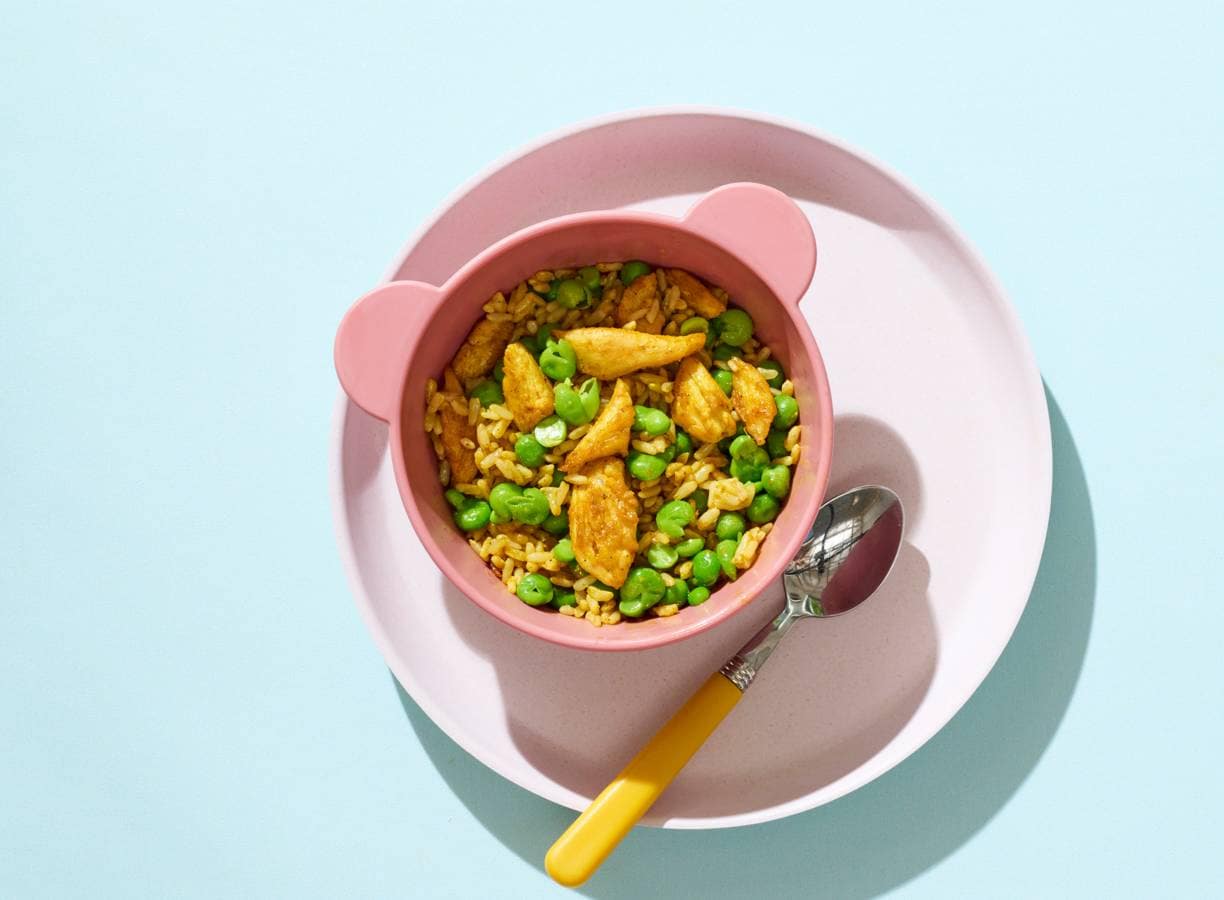 Kip kerrie met zilvervliesrijst en tuinerwten - 12+ maanden (Opperdepop)