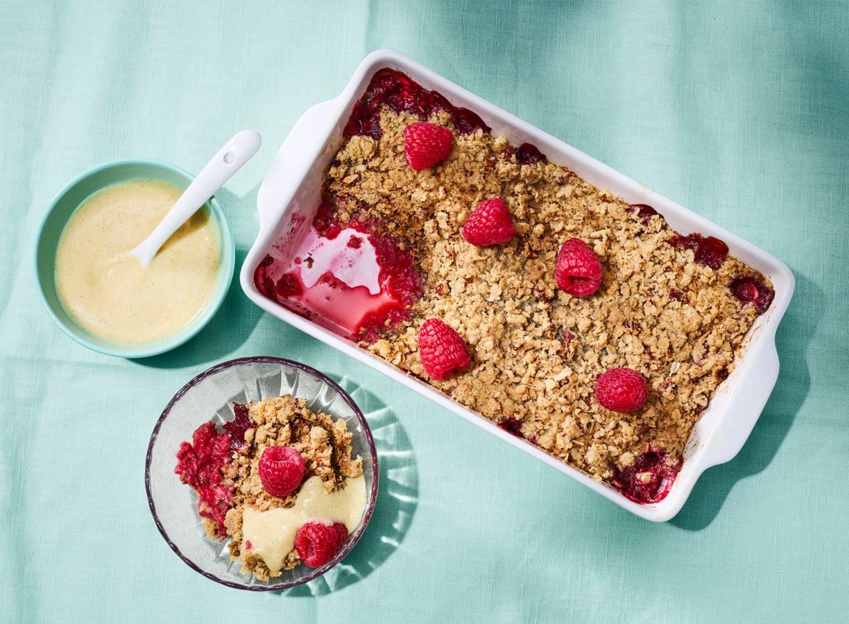 Bij dit fruitige toetje mag je veel kruimels maken. Deze havermoutcrumble van rood fruit en custard is een feestje op tafel.
