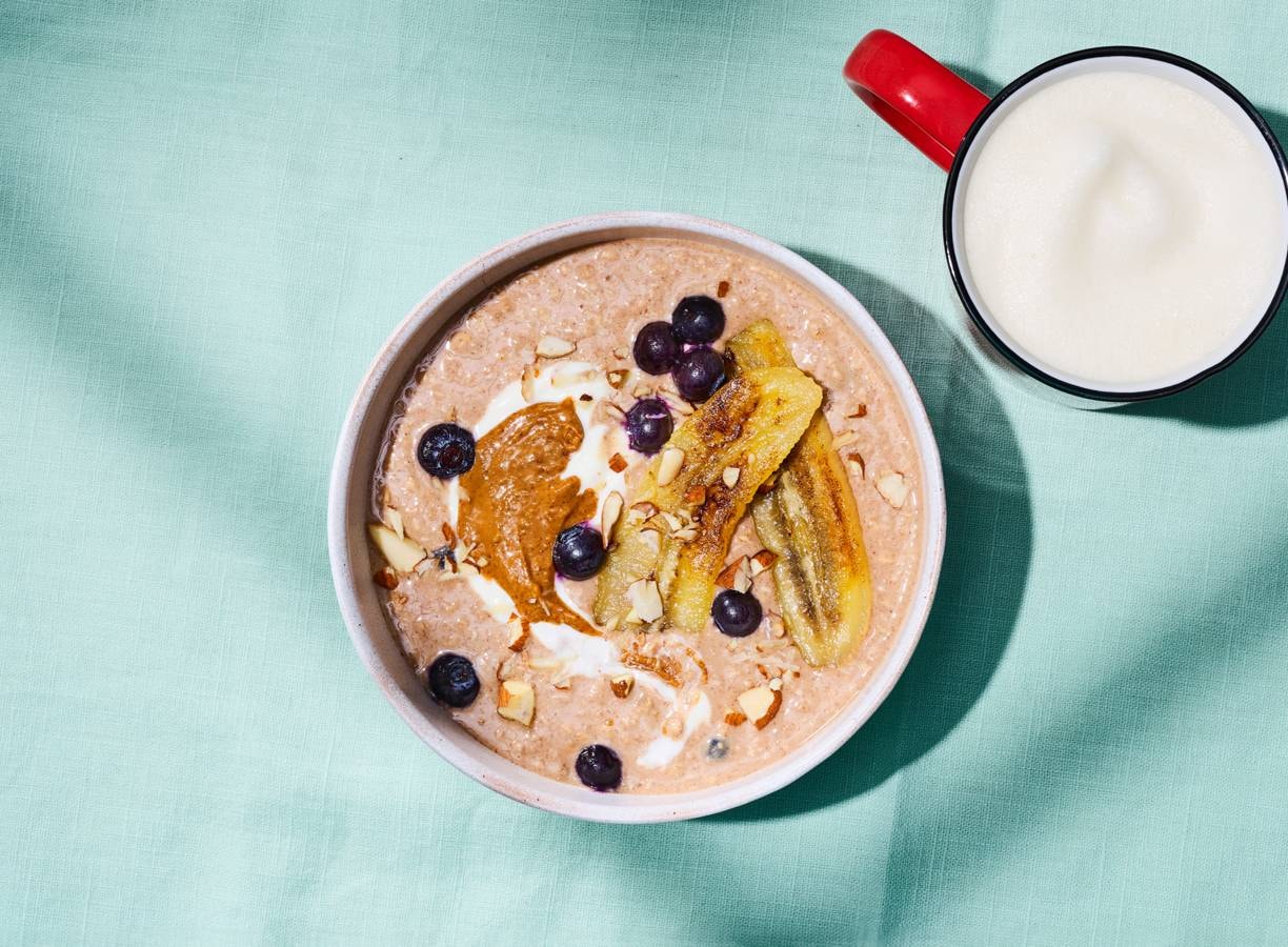 Haast ’s ochtends? Maak deze overnight havermout met banaan, blauwe bessen en pindakaas de avond ervoor klaar. Topontbijt om je dag mee te starten.