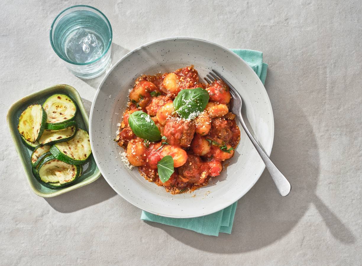 Geen pasta 'n meatballs, maar gnocchi! Handig, de gehaktballetjes en gnocchi stoof je samen in een pan in de saus. Voor wat extra groente: gegrilde courgette!