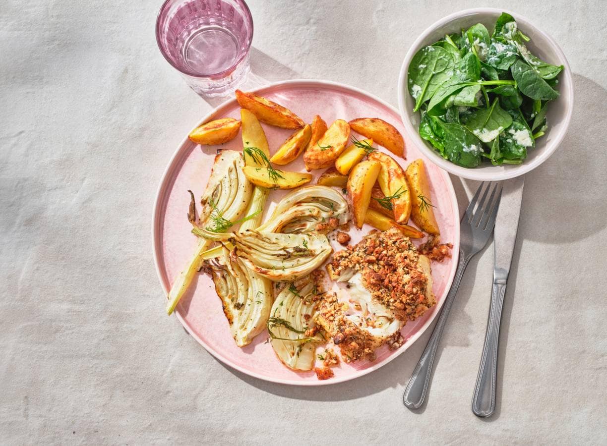 Tegen een zacht stukje kabeljauw en een knapperig jasje van noten zeggen wij geen nee! Je zet de vis in de oven samen met aardappeltjes en venkel, dan doet die lekker het werk! Extra portie groenten? Een simpele spinaziesalade. Easy does it!
