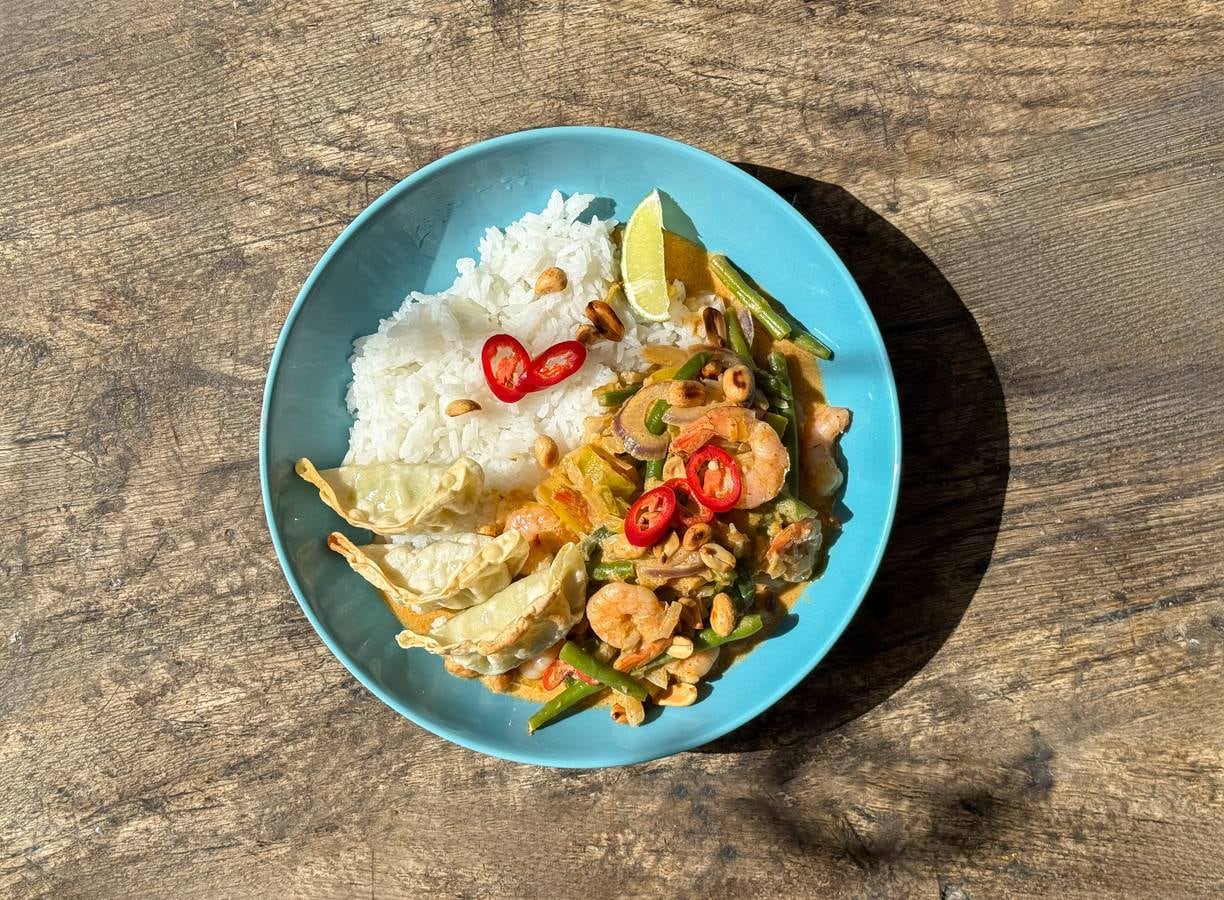 De ideale studentenmaaltijd: snel, vullend en verrassend. Deze rode curry met kipdumplings en garnaaltjes is een soort surf en turf waar je huisgenoten zonder twijfel blij van worden.