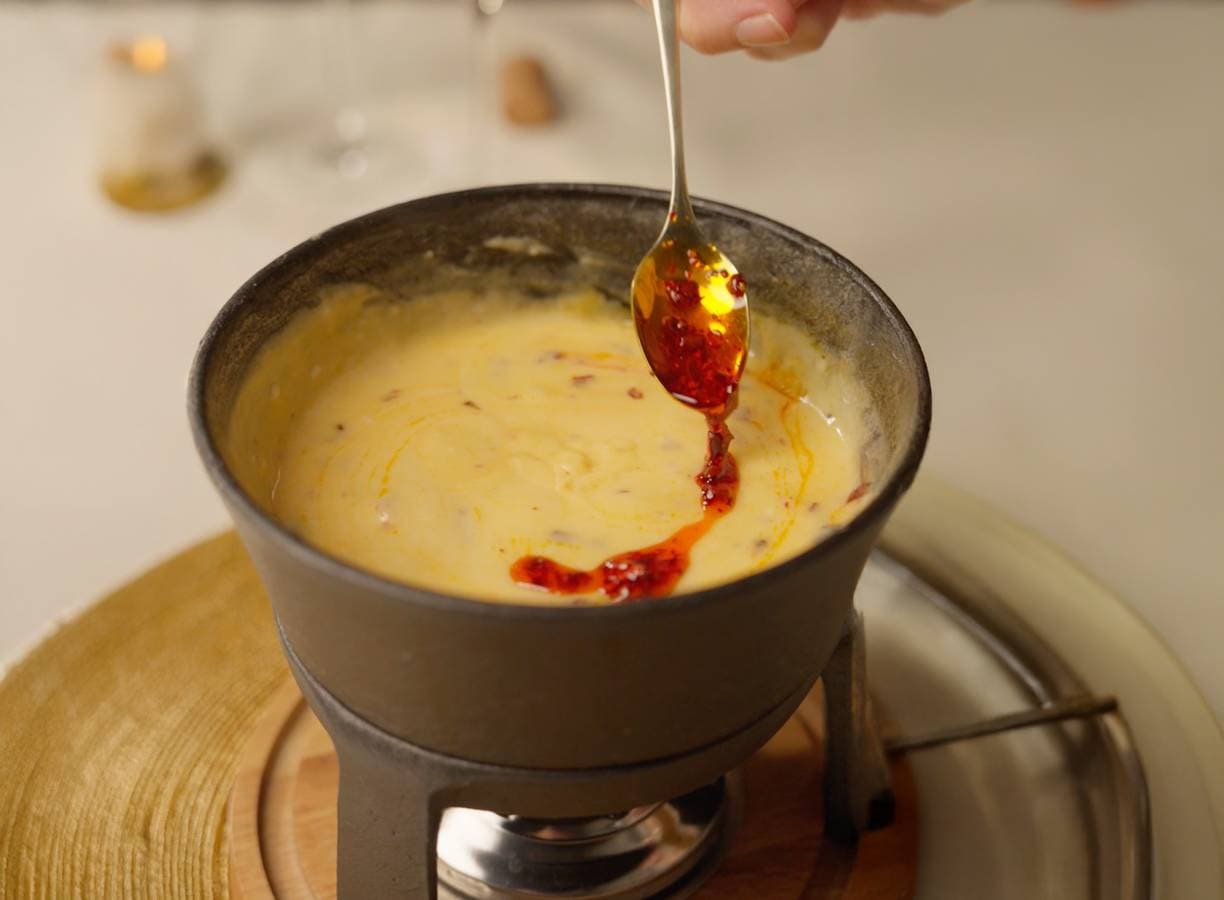 Kaasfondue met een twist. De crispy chili olie zorgt voor wat extra pit in je Zwitserse kaasfondue. Dip met fried chicken, gyoza, bimi en komkommer.