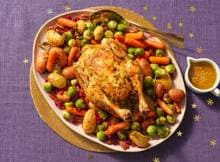 Haal de kip uit de oven, verpak in aluminiumfolie en laat 15 min. rusten. Vang het vocht op uit de braadslee en mix met de mosterd. Wel de cranberry’s 10 min. in warm water. Verhit ondertussen een pan zonder olie of boter op middelhoog vuur en bak de pecannoten bruin. Giet de cranberry’s af. Meng de pecannoten met de cranberries door de groenten en leg op een grote serveerschaal. Leg de gebraden kip ertussen en serveer met de mosterdsaus.