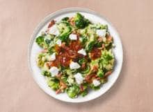 vegatip:Vervang voor een vegetarisch gerecht de gerookte spekreepjes door plantaardige spekjes en bak deze in 1 eetlepel (olijf)olie.