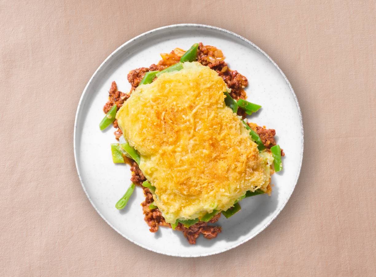 Schep het gehaktmengsel in een ovenschaal en verdeel hierover achtereenvolgens de gebakken snijbonen en de aardappelpuree. Bak 20-30 min. in de oven.