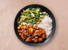 Serveer de gekookte rijst met de ajam smoor en gewokte groentemix. Garneer met de cashewnootstukjes