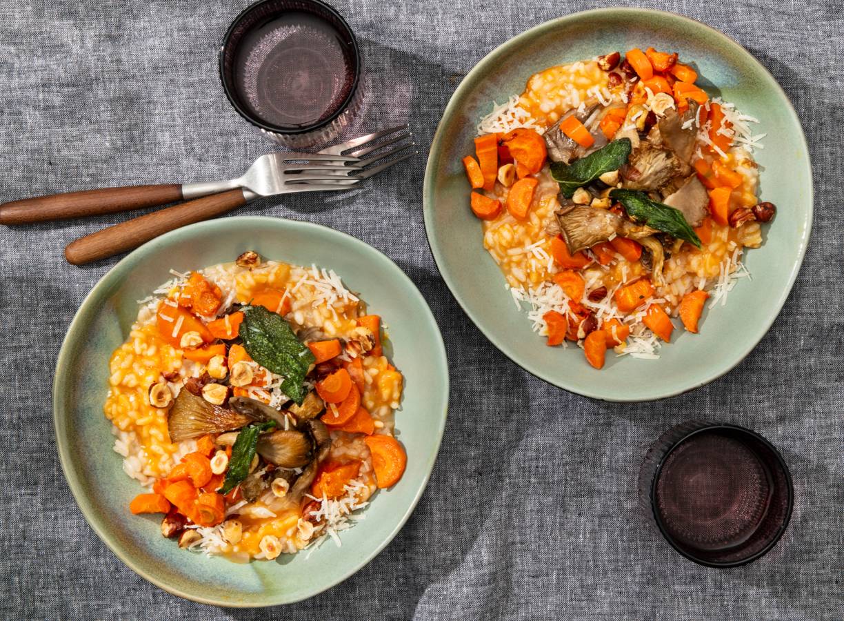 Romige risotto met winterpeen en sjalot, zacht gegaard in bouillon en witte wijn. Met oesterzwam, Parmezaanse kaas, hazelnoot en salie krijgt dit hoofdgerecht een warme, volle smaak en fijne bite.