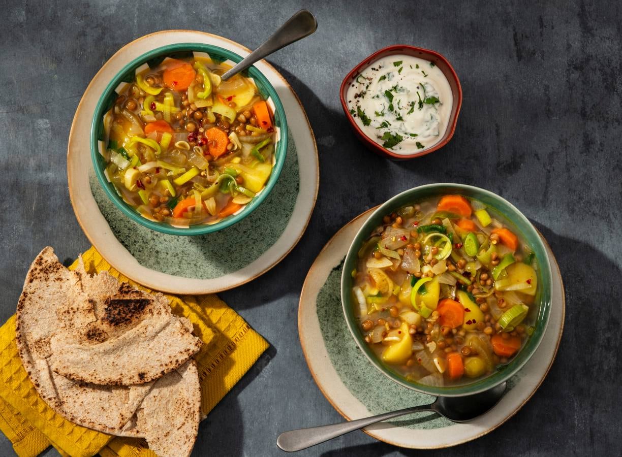 Prei-linzensoep met volkorenplatbrood