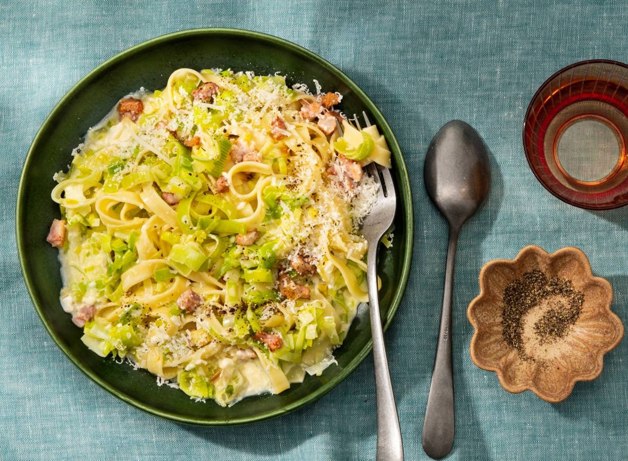 Tagliatelle met prei carbonara