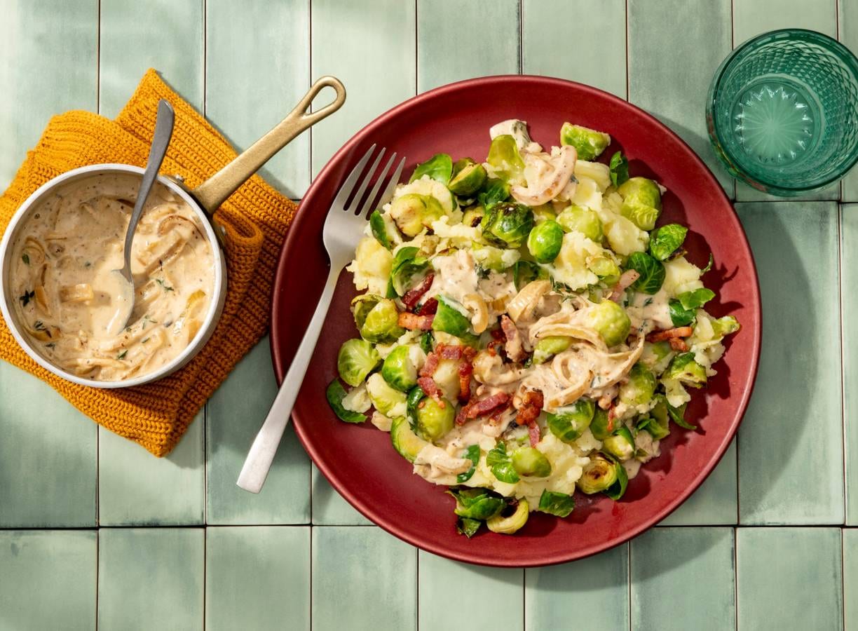 Romige stamppot van aardappel en geroosterde spruitjes met knapperige spekjes. Vol hartige smaken en texturen en perfect voor een koude doordeweekse avond.