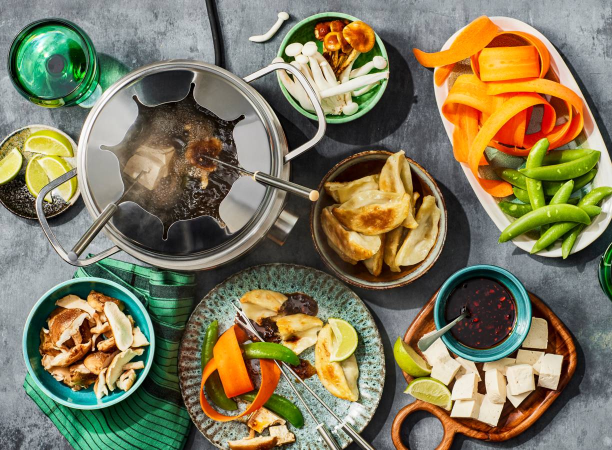 Iedereen kan aan tafel met deze fijne (plantaardige) bouillonfondue. Met een sausje van crispy chili olie kun je na het fonduen vanalles dippen: van paddenstoel tot sugarsnap en van tofu tot gyoza.