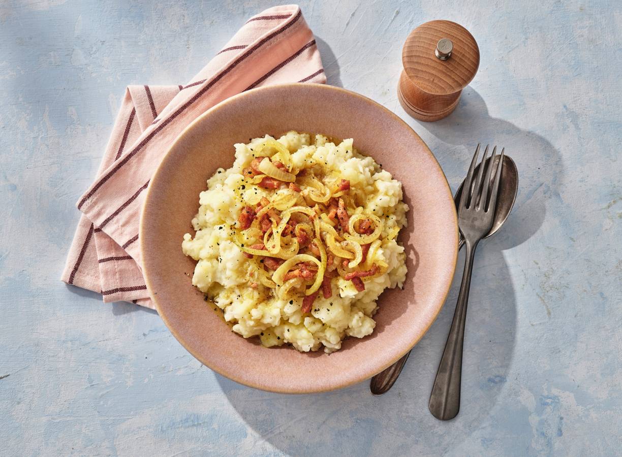 4. Verdeel de stamppot over borden en schep de spekjes met de uien erop.