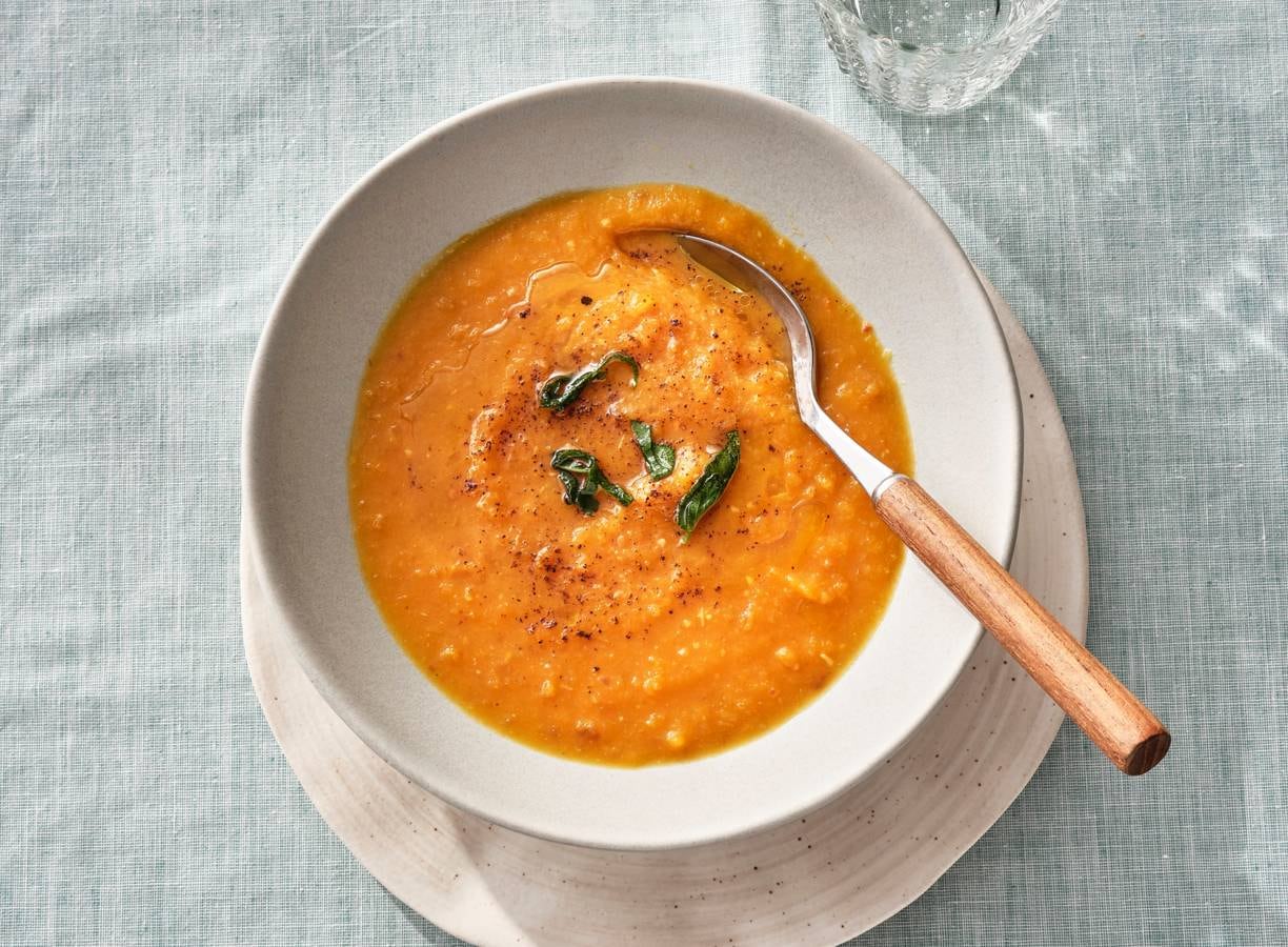Bijna alles van de pompoen gaat in deze fluweelzachte soep: de geroosterde schil én het vruchtvlees, met rode ui, knoflook, piment, salie en een zoete hint van sinaasappel en ahornsiroop. Zó in de oven, even meekoken en pureren maar.