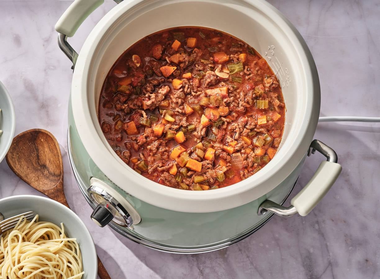 Deze bolognesesaus krijgt uren de tijd in de slowcooker en dat proef je: gehakt, ui, wortel en bleekselderij samen met tomaat, wijn, melk en oregano maken dit tot een volle, rijke saus die perfect is bij pasta. Hartig en heerlijk diep van smaak.