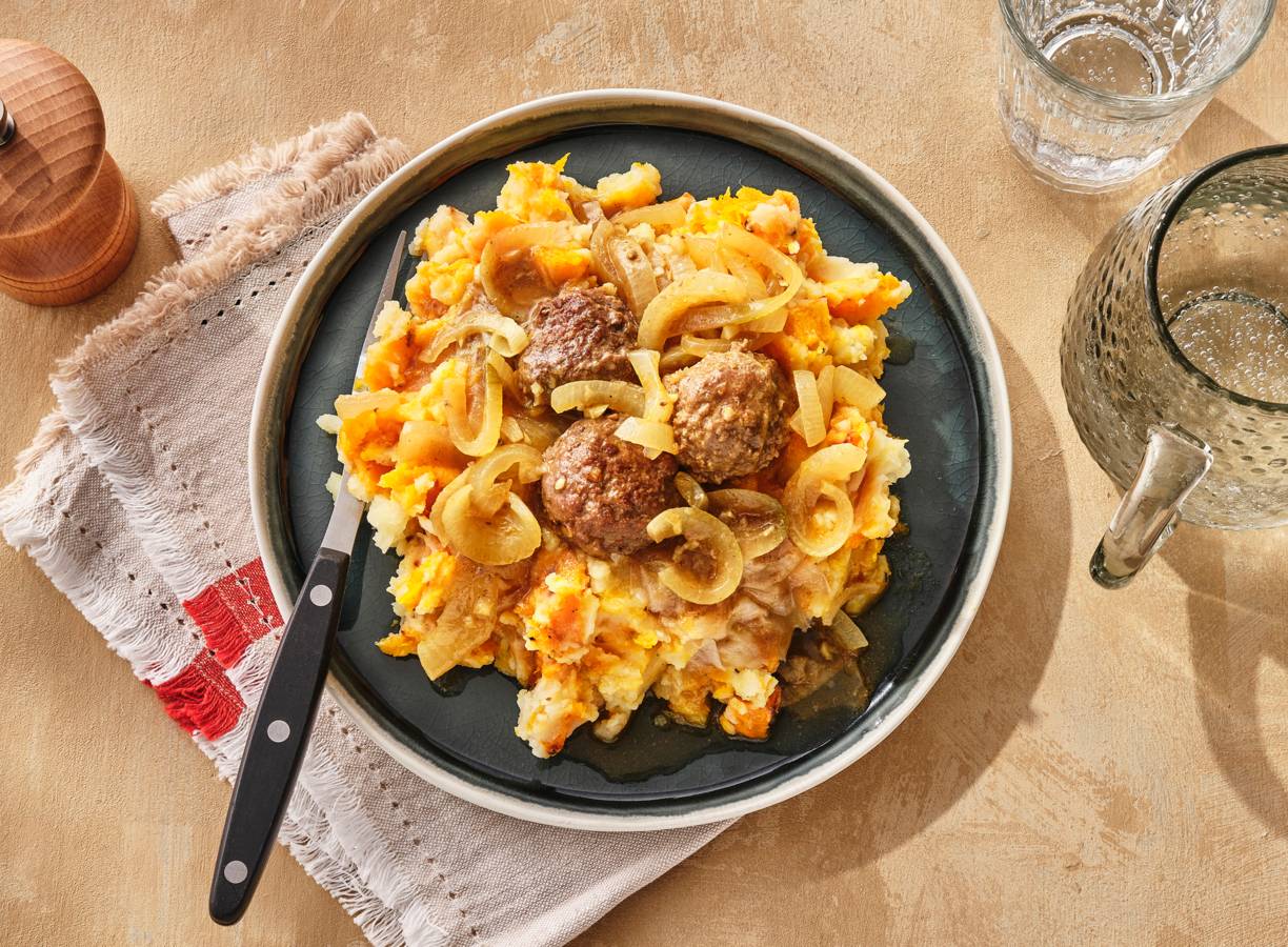 Een goeie twist op de klassieke stamppot, deze geroosterde pompoen en smeuïge aardappel met gehaktballetjes en een kruidige curryjus. Top voor herfstachtige dagen waarop je lekker én gemak wilt.