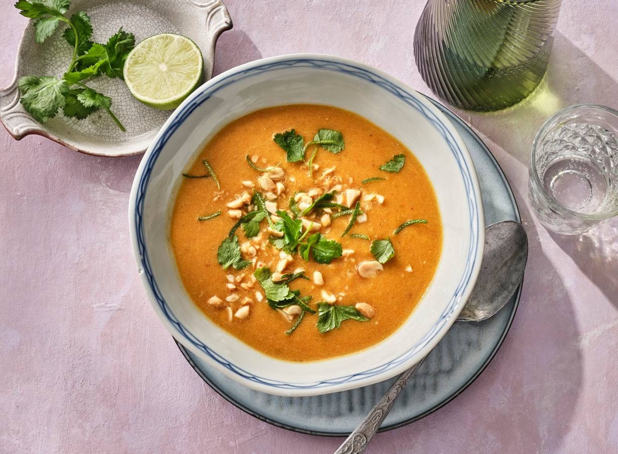 Verdeel de soep over diepe borden en bestrooi met de koriander, pinda’s en het limoenrasp.