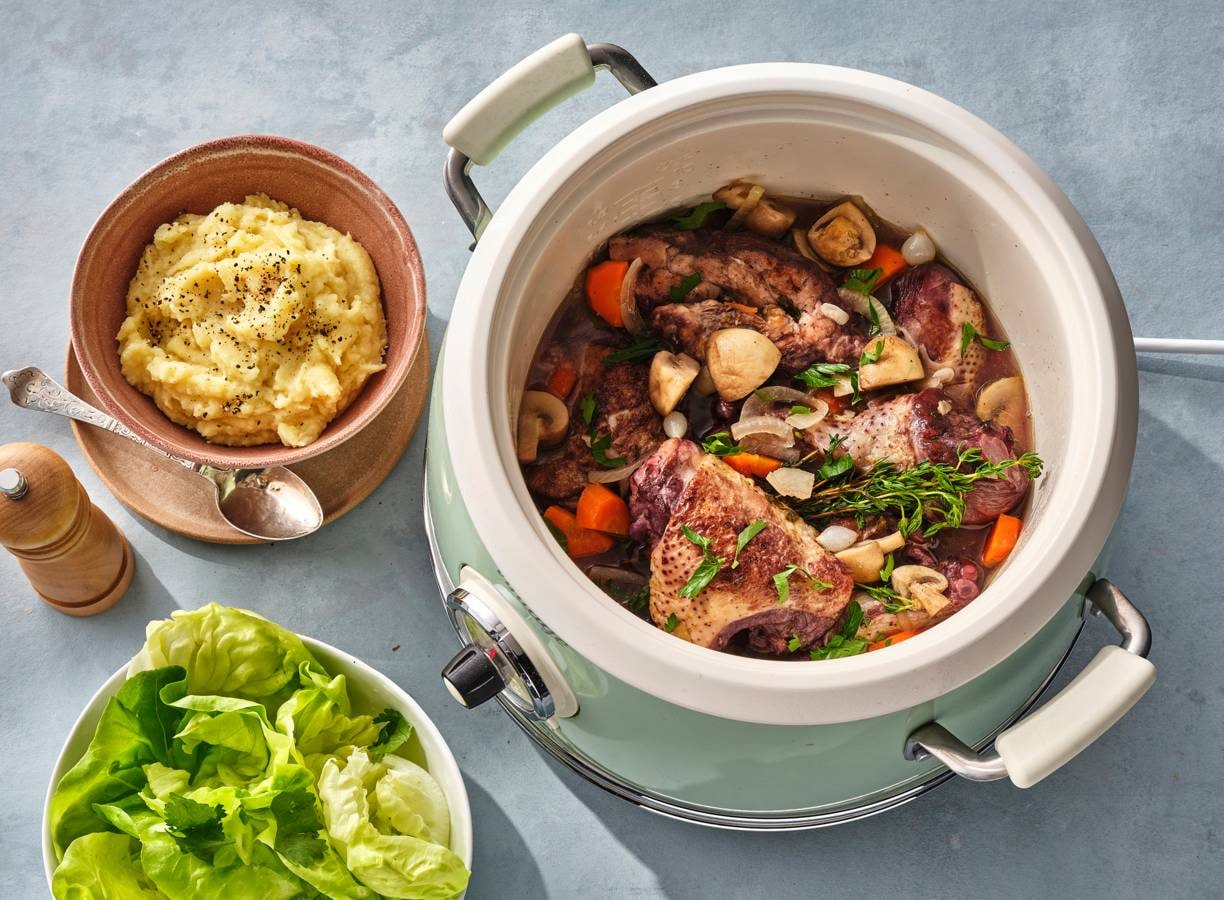 Maak ‘ns een Franse klassieker in de slowcooker. Deze coq au vin met kip, spek, zilveruitjes en champignons in een rijke rodewijnsaus is ideaal als je gasten krijgt: 30 minuten voorbereiden, de pan doet de rest.