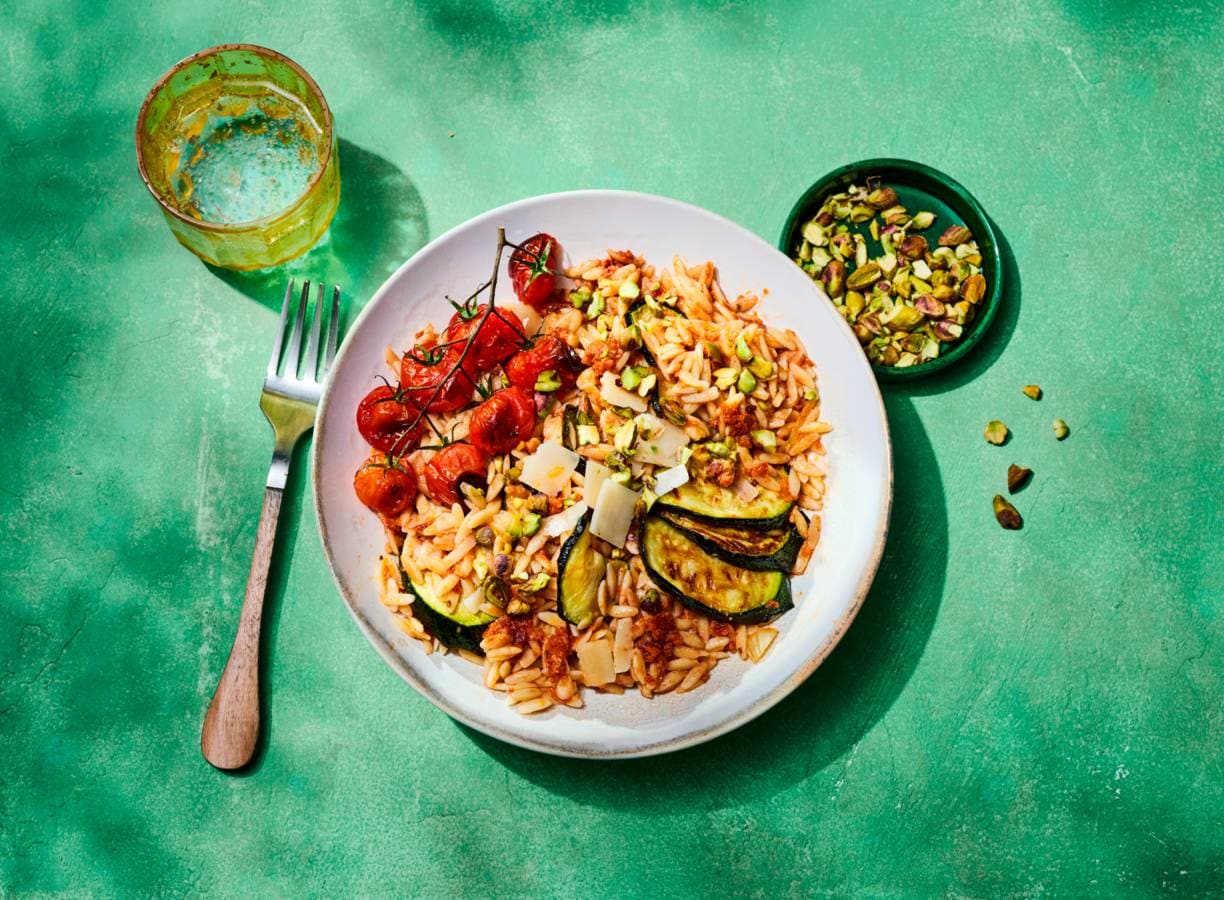 Verdeel de orzo over de borden en verdeel de rest van de courgette, de tomaten, pistachenoten en kaas erover. Serveer direct.